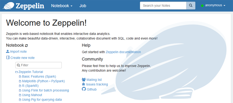 http://127.0.0.1:8080/. You should see the Zeppelin home page shown below. If you