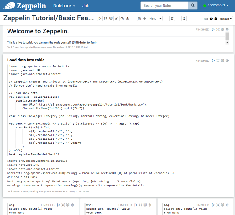 for a more descriptive walkthrough of Zeppelin features and the Tutorial paragraphs.